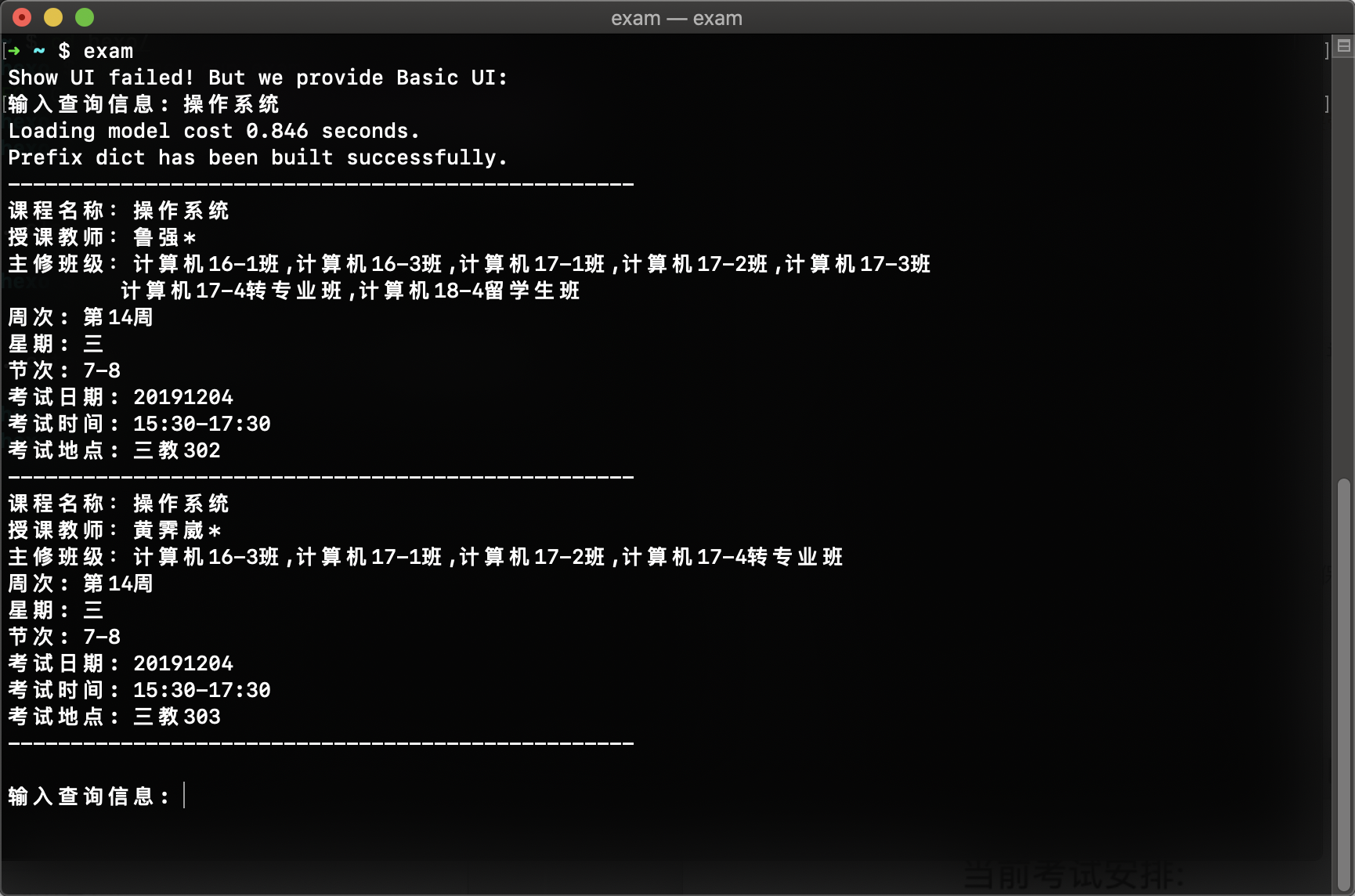 exam命令启动,启动后通过输入课程名称、教师姓名或主修班级来查询相关考试安排。每次脚本启动时会自动更新考试信息,请务必保持网络畅通
